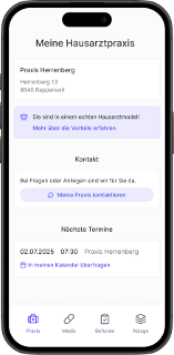 Die Praxis bleibt die zentrale Anlaufstelle – auch im digitalen Alltag. Sie begleitet ihre Patient:innen zwischen den Terminen mit aktuellen Informationen, klarer Kommunikation und einfachen Abläufen. Die Steuerung der Versorgung liegt dabei weiterhin bei der Hausärztin oder dem Hausarzt. Die App stärkt diese Rolle und baut auf der bestehenden Vertrauensbasis auf. Und: Mit der Einführung der App präsentiert sich dieHausarztpraxis als moderne, gut organisierte Anlaufstelle, die ihre Patient:innen zeitgemäss unterstützt.